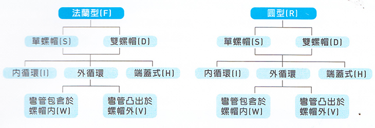 螺帽种类的选用乃依据使用条件,滚珠螺杆螺帽分类代号如下说明